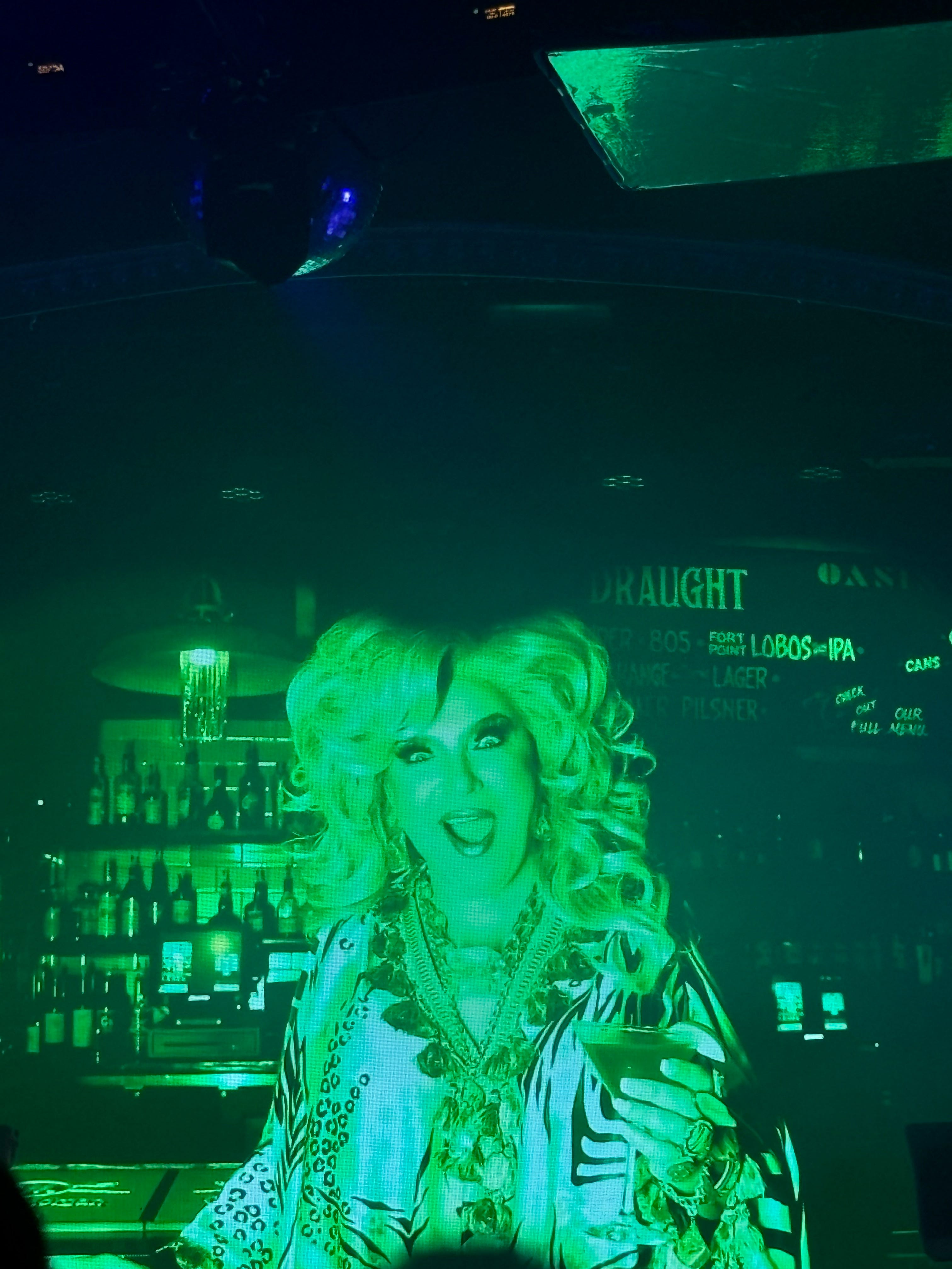 The night vision goggles revealed a well-preserved “dinosaur” in the form of D’Arcy Drollinger, Oasis’s owner, at the bar: