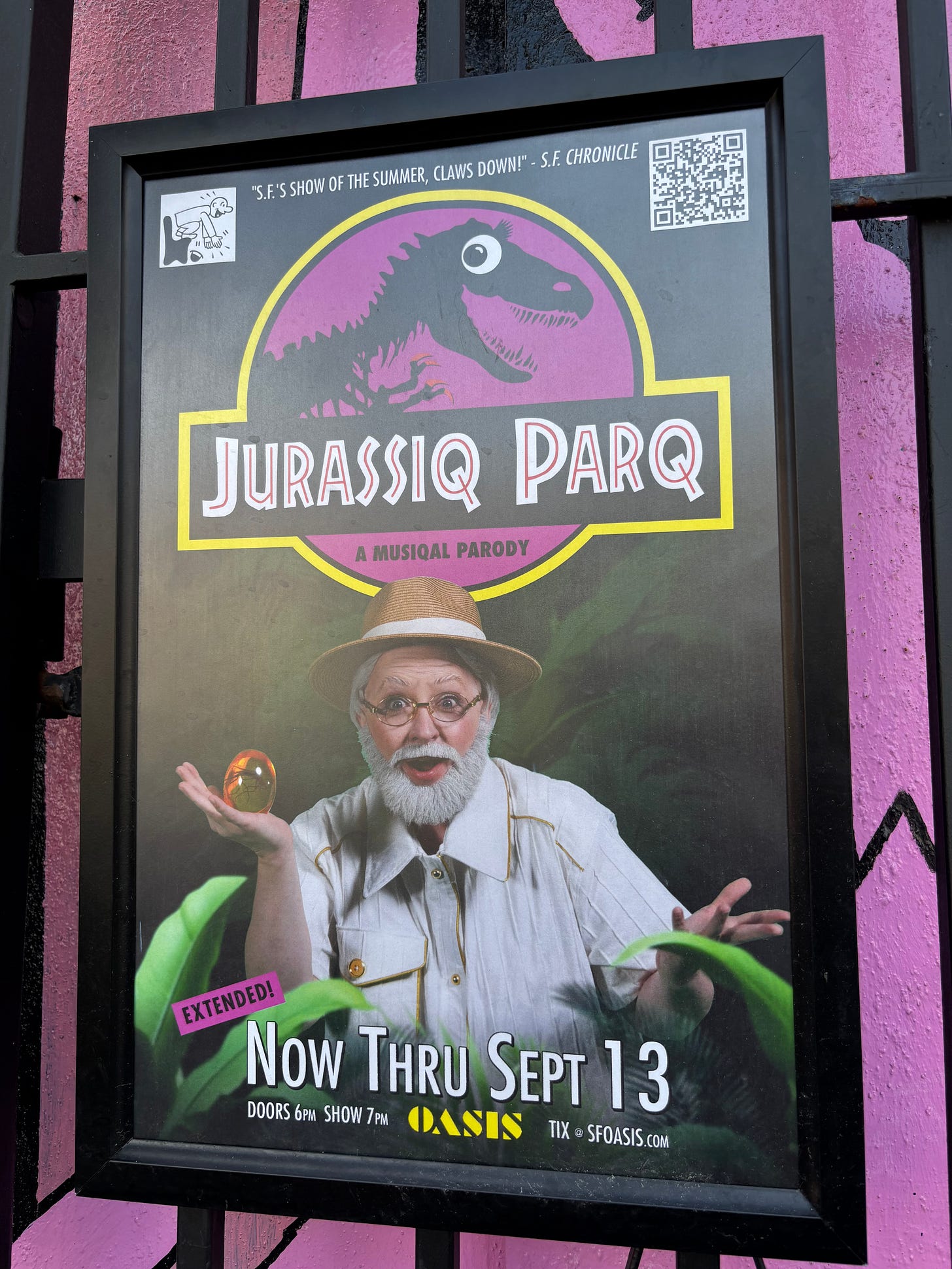 The first “Jurassic Park” movie debuted in June 1993, less than a week before I moved across the U.S. to try my luck in San Francisco. What with packing and moving and settling into my new city, I never got around to seeing it. I couldn’t have imagined then that I wouldn’t watch “Jurassic Park” until a couple weekends ago, more than 32 years after its original release. Or that I’d be watching it on Netflix to prepare for the hilarious “Jurassiq Parq,” a live musical parody of the film playing at the Oasis nightclub in San Francisco.